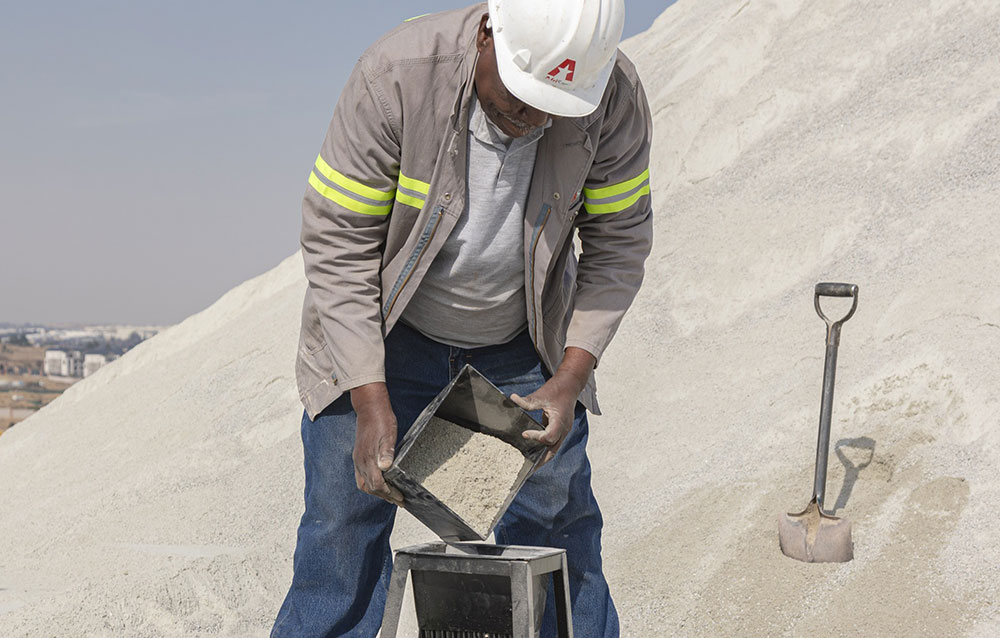 After material has been processed and stockpiled, AfriSam lab personnel collect samples from each stockpile, and regular testing is carried out in accordance with standard test methods for compliance of all aggregate products from each plant with relevant internal and national specifications. Grading results are captured daily to a central computerised system for continuous analysis to ensure consistence in product quality.